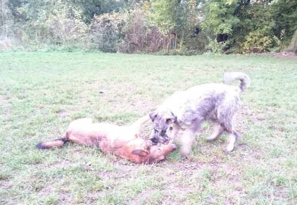 Beim Raufen mit Hundefreundin Cleo (Anfang Dezember):