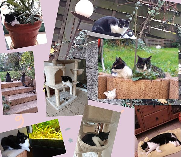 Nach und nach gewöhnte ich mich an meine Menschen, an mein neues Zuhause und auch an eine weitere, ungefähr gleichaltrige Katze, die schon vorher dort gewohnt hatte. Zuerst hat sie mich nur angefaucht und fand überhaupt nicht toll, dass sie ihr Terretorium jetzt mit mir teilen sollte. Aber dann hat sie irgendwann gemerkt, dass ich ganz lieb bin und wir haben uns angefreundet. Das sieht man auch auf dem einen Foto, wo ich mit der Katze mit dem weißen Näschen kuschele. Sie weiß, dass ich ein bisschen ängstlich und schüchtern bin und sie passt auf mich auf wie eine große Schwester. Meine Menschen dürfen jetzt auch schon mal mit mir schmusen. Ich komme zwar nicht wie meine Katzenfreundin auf den Schoß, das ist mir zu nah. Aber wenn sie mich mal so im Vorbeigehen streicheln, genieße ich das sehr, werfe mich auf den Boden und schnurre ganz laut. Inzwischen bleibe ich dann auch gerne liegen und lasse ich mich länger kraulen. Auf den Arm nehmen darf man mich aber nicht, da kriege ich sofort panische Angst und fliehe. Aber meine Menschen machen das auch nicht, dafür haben sie meine Katzenfreundin, die das gerne mag.