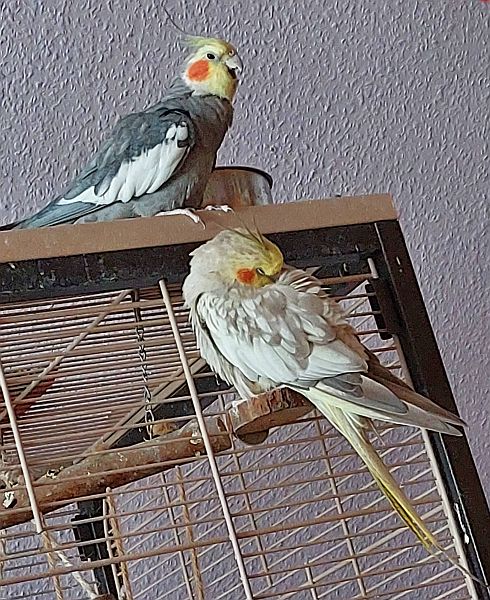 Ich werde in ca. 2-3 Jahren nach England ziehen und kann nicht alle meine Nymphensittiche mitnehmen. Deshalb suche ich ein neues Zuhause für ein Männchen und ein Weibchen: Stolas und Max.