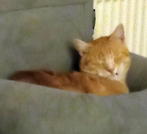 Er ist orangefarbig und hat am Mäulchen auf der linken Seite einen gut verheilten Riß.